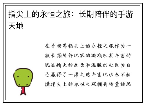 在手游界,指尖上的永恒之旅作为一款长期陪伴玩家的游戏,以其丰富的玩法、精美的画面和温暖的社区,为自己赢得了一席之地。 丰富玩法,永不枯燥 指尖上的永恒之旅拥有海量的玩法,满足不同玩家的需求。从激烈的战...